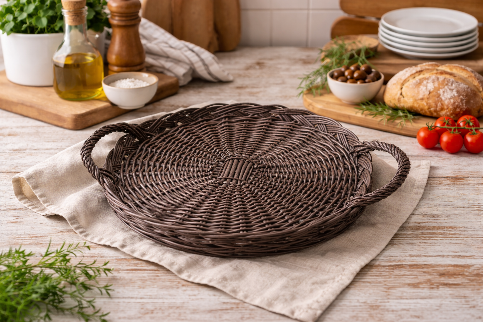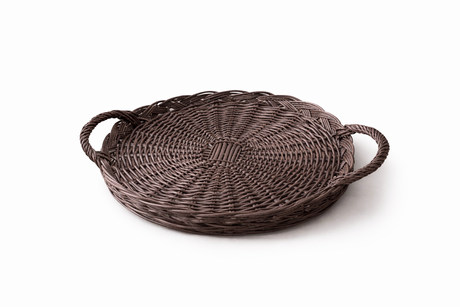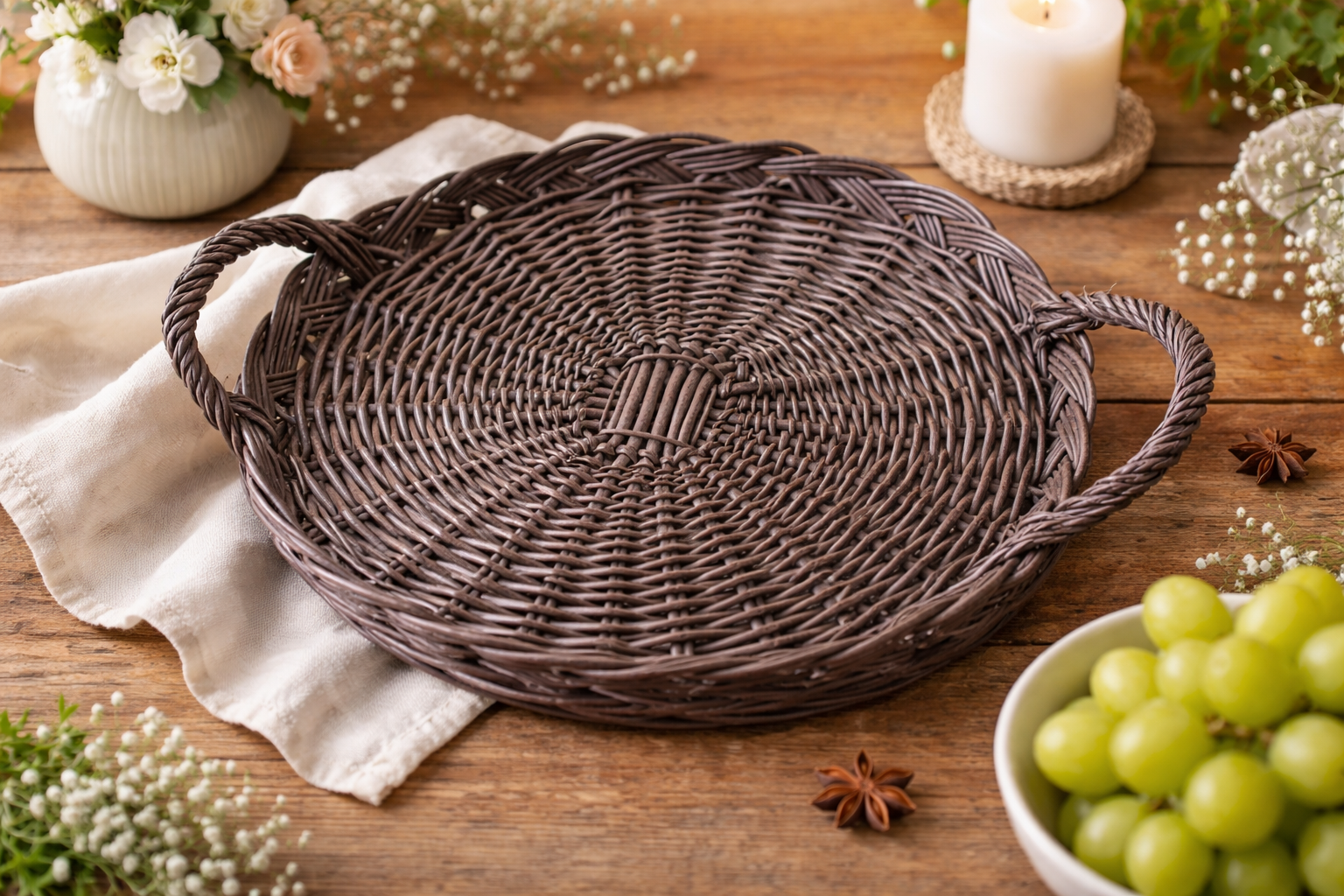 Esta bandeja de mimbre destaca por su forma redonda y equilibrada, con dos asas laterales firmes y bien integradas que facilitan el transporte sin restar armonía al conjunto. El trenzado, realizado con varilla resistente, dibuja un entramado radial en la base que aporta solidez y una estética cuidada, mientras que el borde ligeramente ondulado le da un acabado más decorativo y artesanal.