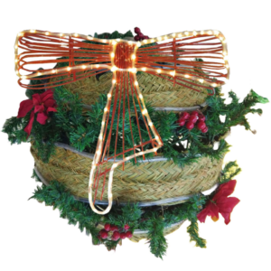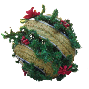 Muy decorativa esta bola navideña elaborada con esparto y ciprés. Para adornar cualquier espacio. Se puede fabricar en otros tamaños y se puede poner en el exterior o interior. los pequeños detalles como ponsetias y acebo le da un toque muy especial. El lazo es opcional pero le da un aire muy elegante.
