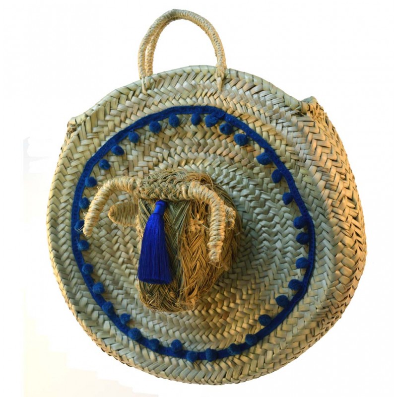 Bolso de palma decorado con cabeza de toro y madroños. Artesanía.