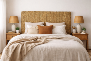 Cabecero de esparto 100% natural. Fabricado en España con fibra natural. Un material sostenible y muy respetuoso con el medio ambiente. Complete la decoración de su dormitorio con esta pieza realizada a mano. Un complemento que además de decorar y enmarcar la cama de manera natural también protege sus paredes. Un diseño sencillo y atemporal que resulta sofisticado y moderno a la vez que encajará en estilos decorativos como el natural, o mediterráneo.