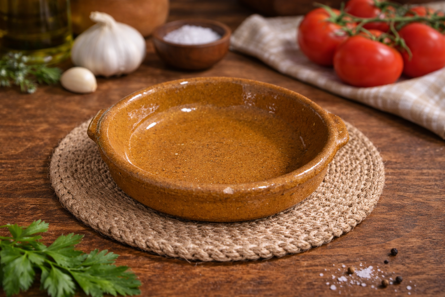 Esta cazuela no es solo un utensilio de cocina, sino también un elemento decorativo y de presentación. Colocada sobre una mesa de madera, acompañada de ingredientes frescos como ajo, tomate o aceite de oliva, transmite inmediatamente esa sensación de cocina mediterránea, casera y auténtica. Es perfecta para quienes disfrutan de cocinar con calma, con tradición y con utensilios duraderos.