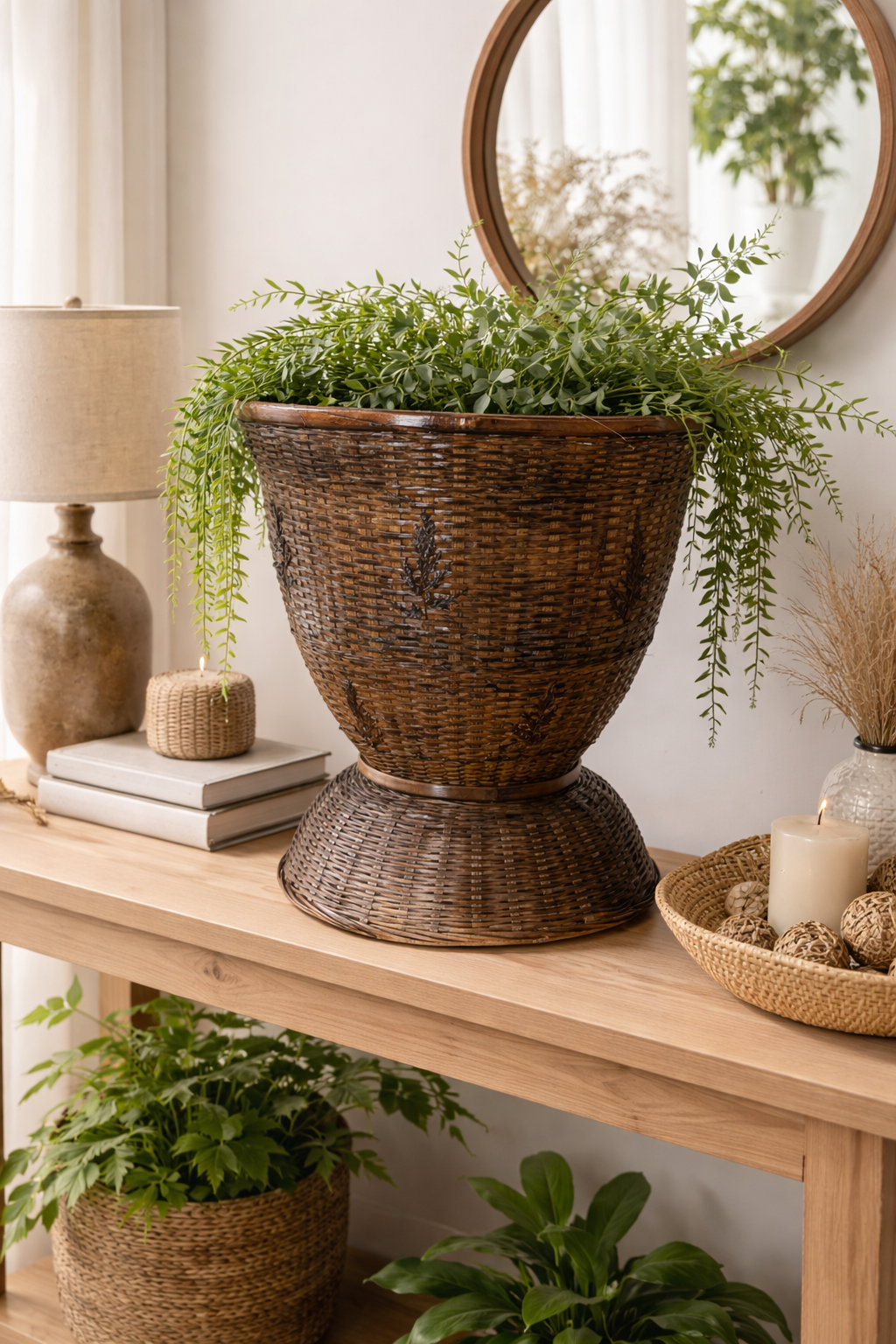 Gracias a su diseño versátil, puede utilizarse como elemento decorativo por sí mismo o como recipiente para composiciones florales, plantas, ramas secas o arreglos naturales. Queda especialmente bien en recibidores, salones, porches o espacios comerciales donde se busque crear una atmósfera cálida y acogedora.