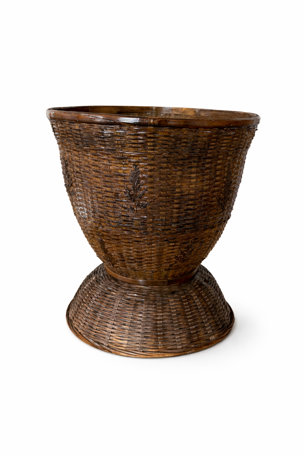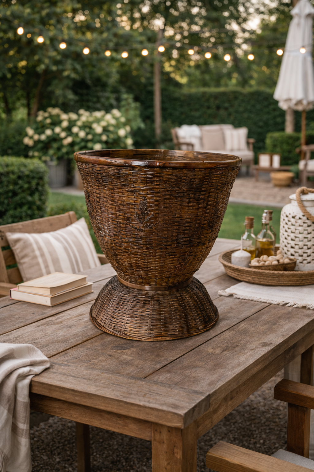 Esta elegante copa decorativa está elaborada artesanalmente en bambú trenzado y acabada en un cálido tono marrón que resalta la textura natural de la fibra. Su forma equilibrada, con cuerpo amplio y base elevada, recuerda a las piezas tradicionales utilizadas desde antiguo en la decoración mediterránea, aportando presencia y carácter allí donde se coloque.