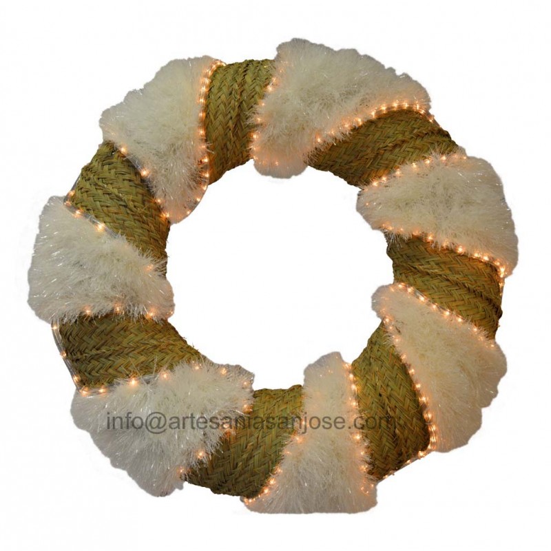 Corona espumillón y esparto con lazo y con luz. Ideal para decoración de Navidad, exterior e interior. Fabricada eN España.