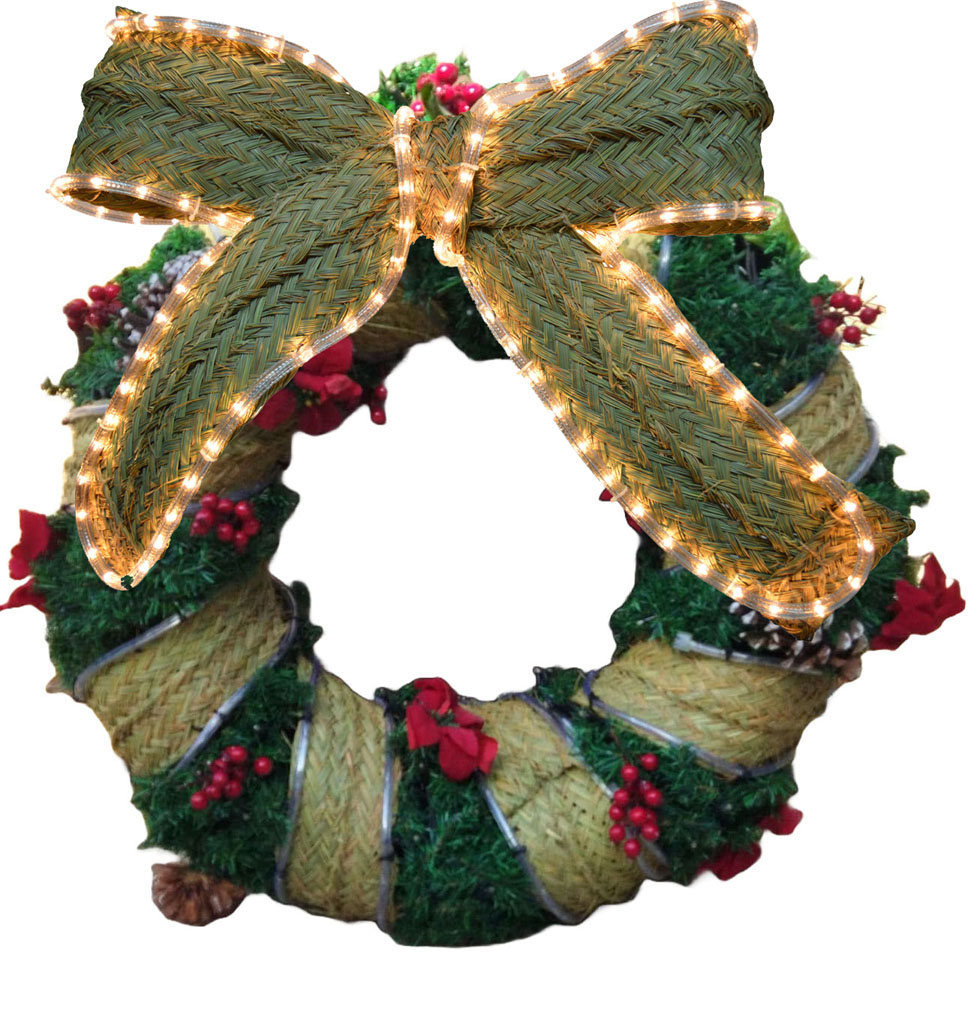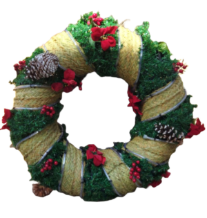 Corona navideña muy llamativa, elaborada con esparto, ciprés y decorada con acebo y ponsetias.