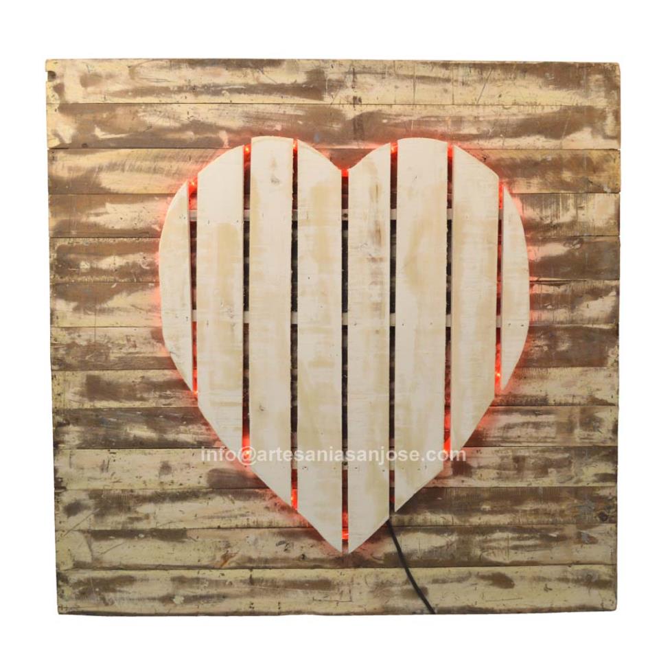 Cuadro corazón madera, iluminado con luz led roja, ideal para decoración de paredes. Medida del corazón 63×72 cms. Fabricado en España artesanalmente.