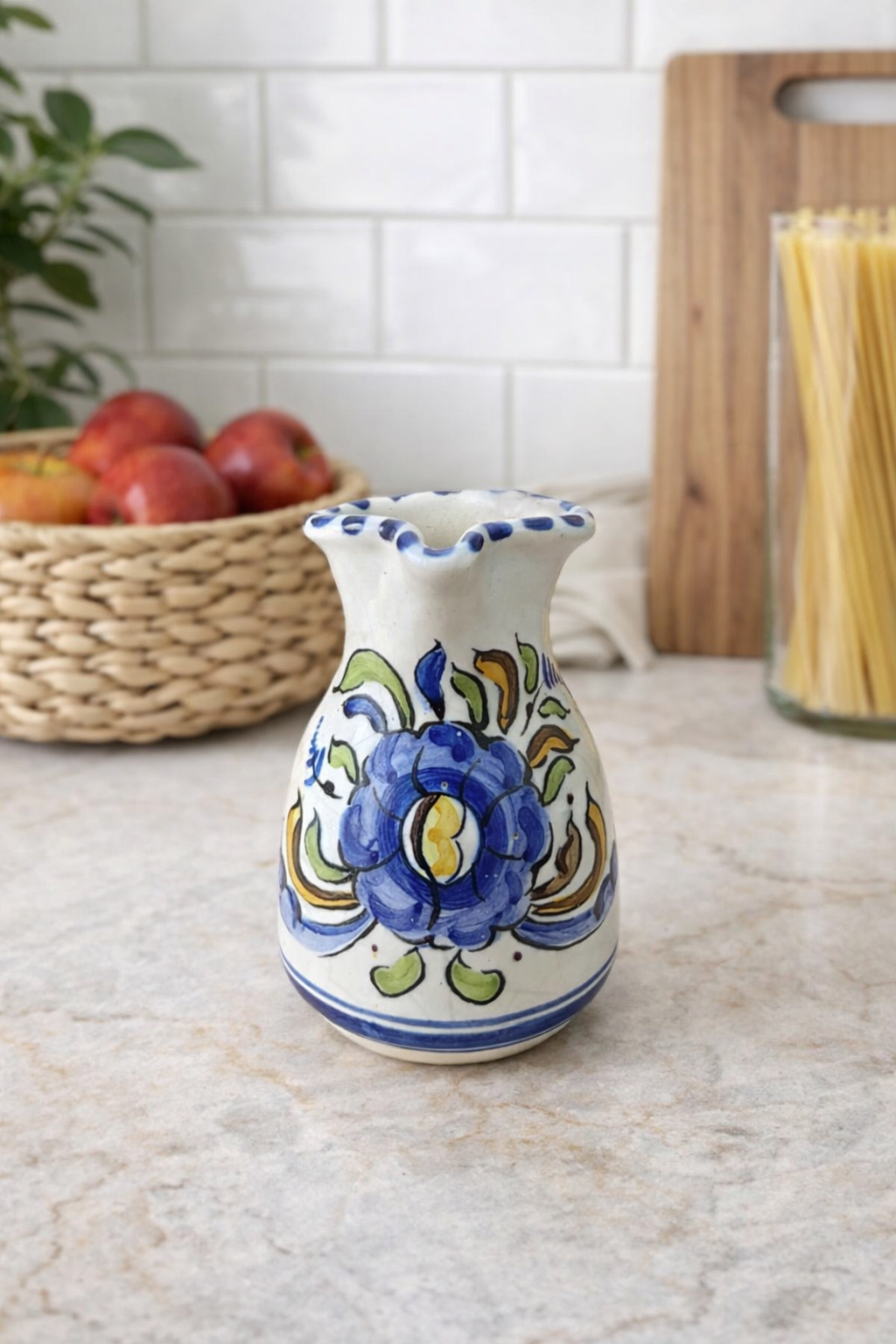 La pieza presenta una composición floral protagonista en color azul intenso, acompañada de hojas y trazos ornamentales que aportan movimiento, frescura y riqueza visual. Cada detalle transmite el valor de lo hecho a mano, con esas pequeñas variaciones y matices que convierten cada jarrón en una pieza única. No es solo un objeto decorativo, sino un elemento con alma, capaz de vestir por sí solo una estantería, una consola, una vitrina, una mesa auxiliar o una cocina con aire mediterráneo y acogedor.