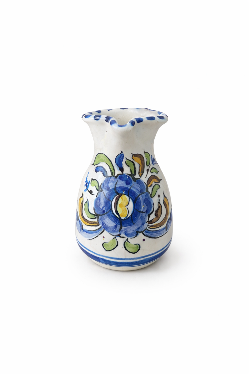 Este pequeño jarrón de cerámica destaca por su encanto tradicional y por la delicadeza de su decoración pintada a mano. Su silueta redondeada y equilibrada, rematada con una boca ondulada de perfil suave, le aporta una presencia elegante y muy decorativa, ideal para dar un toque artesanal a cualquier rincón de la casa. La base blanca realza especialmente el dibujo floral central en tonos azules, verdes y ocres, creando un contraste luminoso y lleno de personalidad que recuerda a la cerámica decorativa de siempre, hecha con gusto y con oficio.