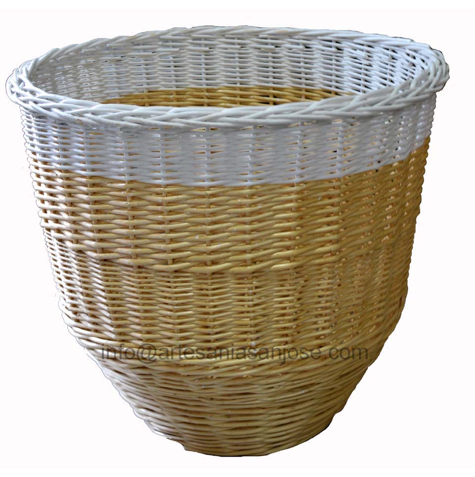 Macetero fabricado en mimbre natural con franja blanca. Ideal para decoración de estancias, exterior e interior, se puede encargar a medida. fabricado en España.