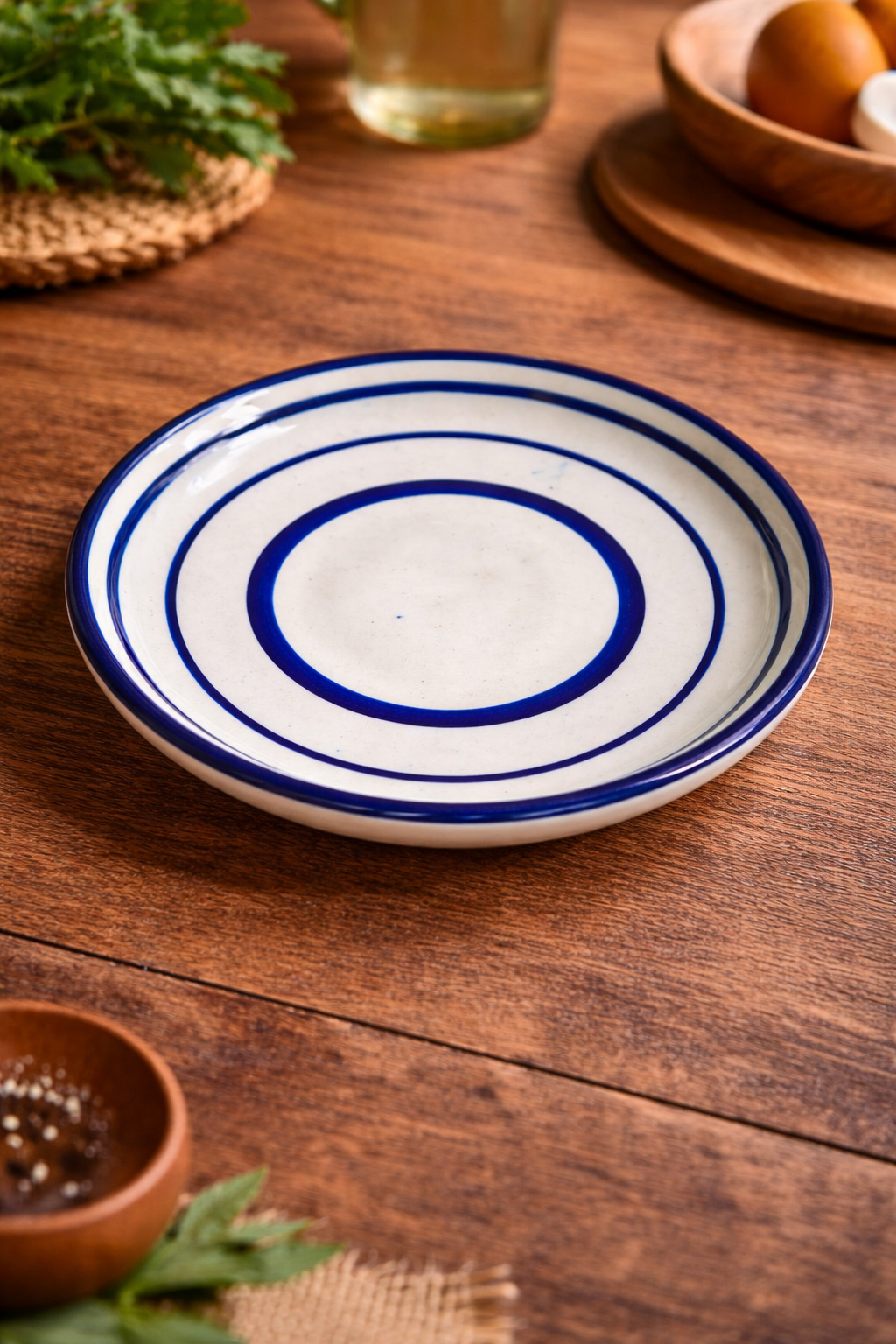 Este plato de cerámica es una pieza sencilla y elegante, inspirada en la loza tradicional de siempre. Su diseño limpio, con líneas circulares en azul intenso sobre fondo claro, transmite equilibrio y armonía, recordando a la vajilla artesanal que ha acompañado durante generaciones las mesas familiares.