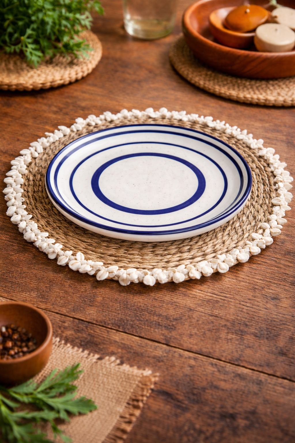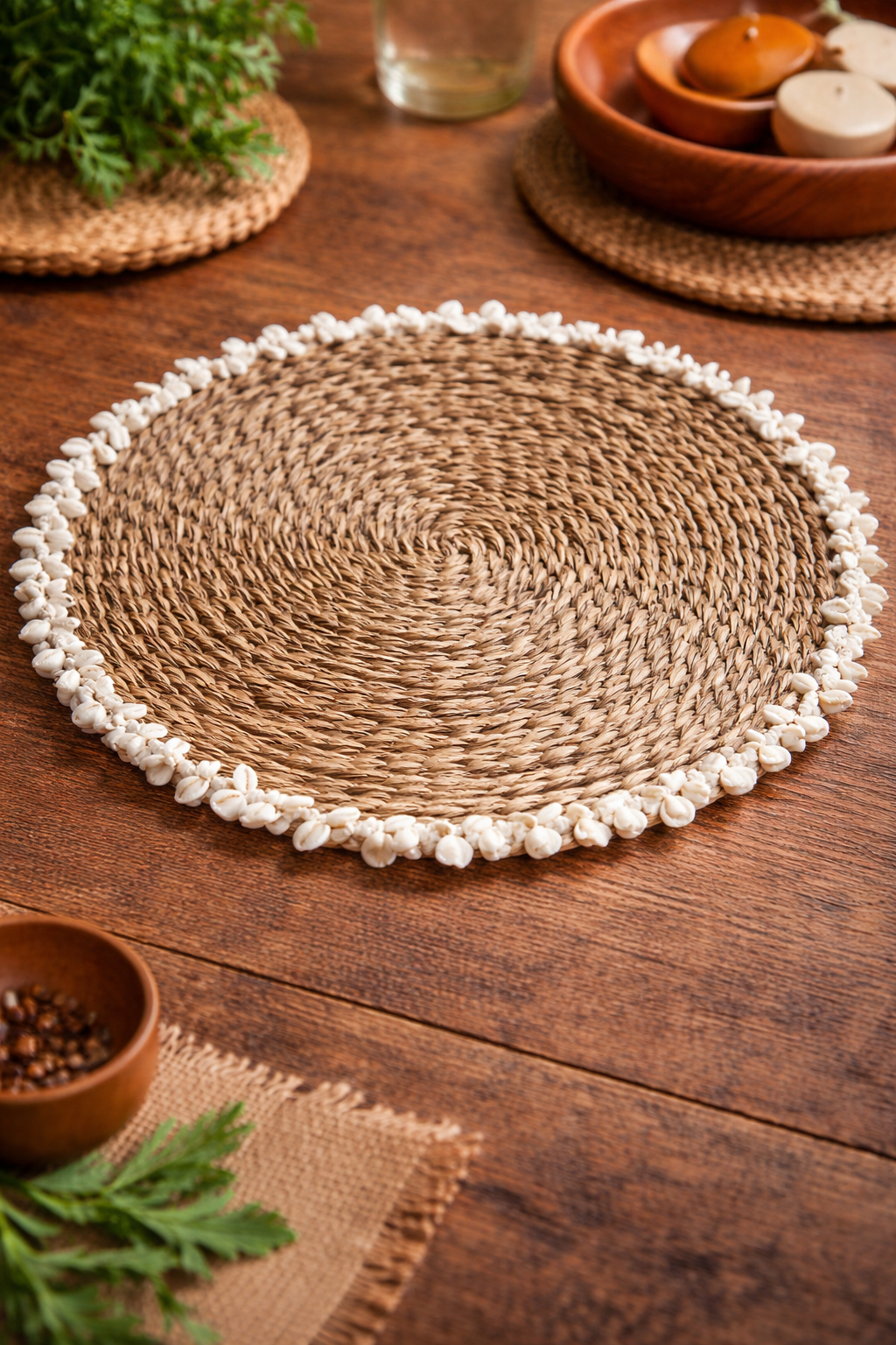 El trenzado, en tonos naturales y cálidos, aporta textura y profundidad, convirtiendo el salvamantel en un elemento que no solo protege la mesa, sino que también la viste. Alrededor del perímetro, un delicado remate de conchas naturales colocadas una a una aporta un contraste elegante y luminoso, evocando el mar, la costa y los ambientes mediterráneos tan ligados a la decoración artesanal.