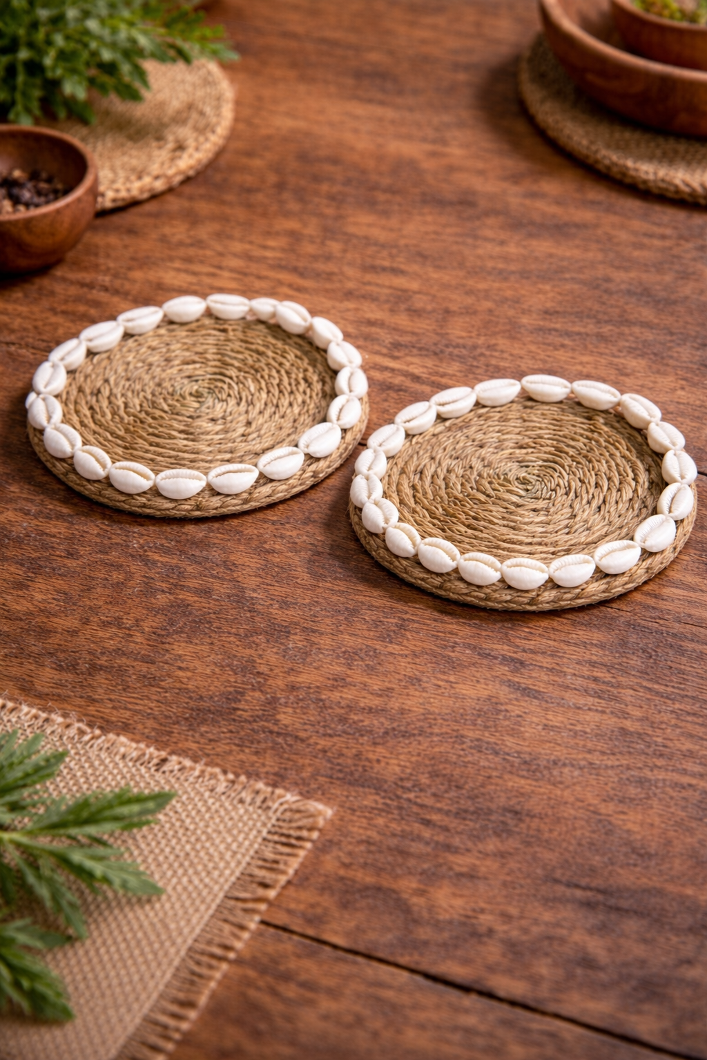 Estos posavasos con conchas son piezas decorativas y funcionales que destacan por su carácter natural y artesanal, pensadas para vestir la mesa con sencillez y buen gusto. Están elaborados a partir de fibra vegetal trenzada, formando una base circular compacta y resistente, que se remata cuidadosamente con un borde de conchas naturales colocadas una a una, creando un contraste muy armonioso entre textura y color.