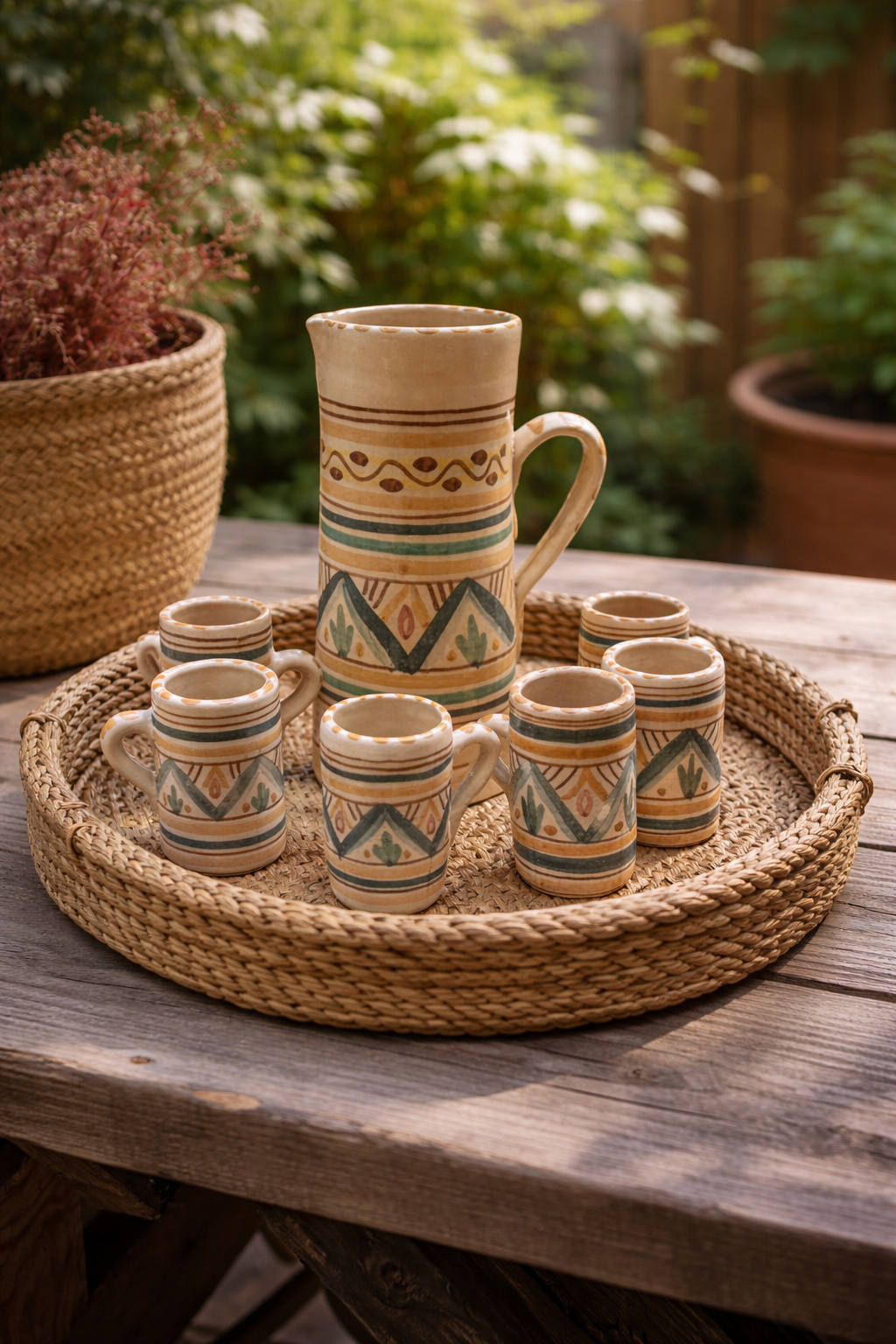Acompañando a la jarra encontramos varios vasitos a juego, de tamaño ideal para un servicio práctico y bonito. Todos siguen el mismo estilo decorativo, con motivos geométricos y líneas horizontales, creando un conjunto armonioso y elegante sin necesidad de ser recargado. Además, el hecho de que sean piezas de cerámica aporta un punto muy especial: mantienen la bebida fresca, se sienten agradables en la mano y hacen que cada uso tenga un encanto distinto, mucho más auténtico que cualquier vaso industrial.
