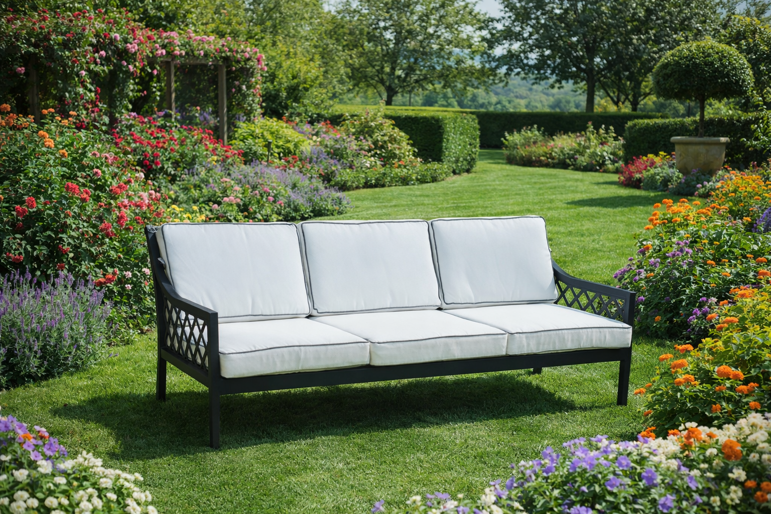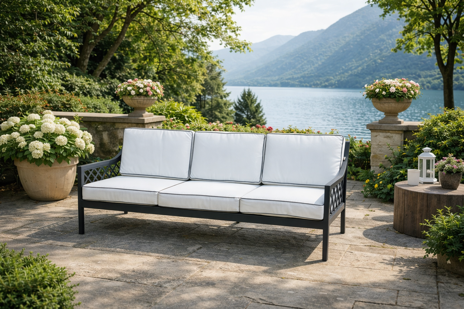 El diseño incorpora laterales con detalle enrejado que aligeran la pieza y le dan un toque elegante y atemporal. Los cojines, amplios y confortables, en tono claro con vivo perimetral, aportan luminosidad y contraste, reforzando esa sensación de frescura tan adecuada para terrazas y jardines.