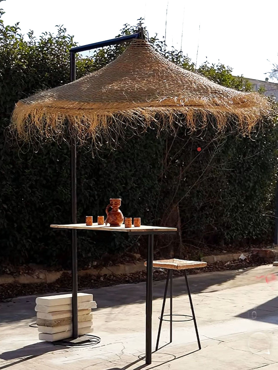 Esta pieza de esparto está hecha artesanalmente. El esparto, una fibra natural, se teje cuidadosamente para lograr el aspecto deseado. Cada detalle del diseño se ajusta a la medida exacta del área donde se colocará la sombrilla, garantizando una integración perfecta en la decoración.